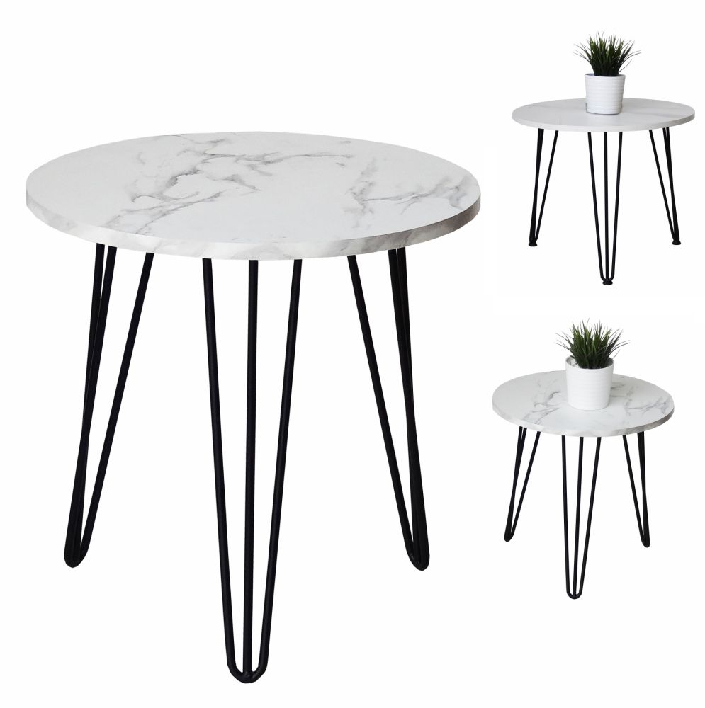Stolik kawowy o średnicy 70cm. Dzięki swym wymiarom doskonale sprawdza się w niewielkich pomieszczeniach. Idealnie nadaje się do każdego wnętrza. Blat wykonany z płyty laminowanej o grubości 18mm. Nogi Hairpin legs skośne pochylone od pionu ok. 7-8 stopni. Wykonane są ze stalowego pręta malowanego proszkowo, który zapewnia wytrzymałość oraz stabilność stolika. W zestawie komplet gumowych ochraniaczy na metalowe nogi.