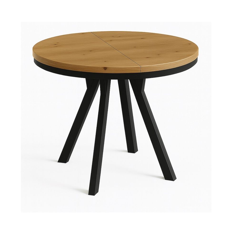 Funkcjonalny stół rozsuwany o średnicy blatu Ø 100cm z trzema wkładkami (3x50cm). Do rozsuwania blatu zastosowane są solidne metalowe prowadnice. Blat o grubości 36mm, oklejony okleiną PCV.