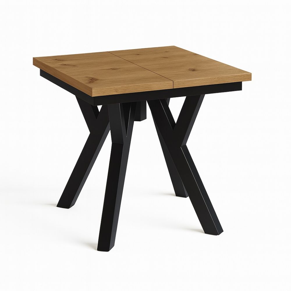 Funkcjonalny stół rozsuwany o wymiarach blatu 80cm x 80cm z jedną wkładką (1x50cm). Do rozsuwania blatu zastosowane są solidne metalowe prowadnice. Blat o grubości 36mm, oklejony okleiną PCV.