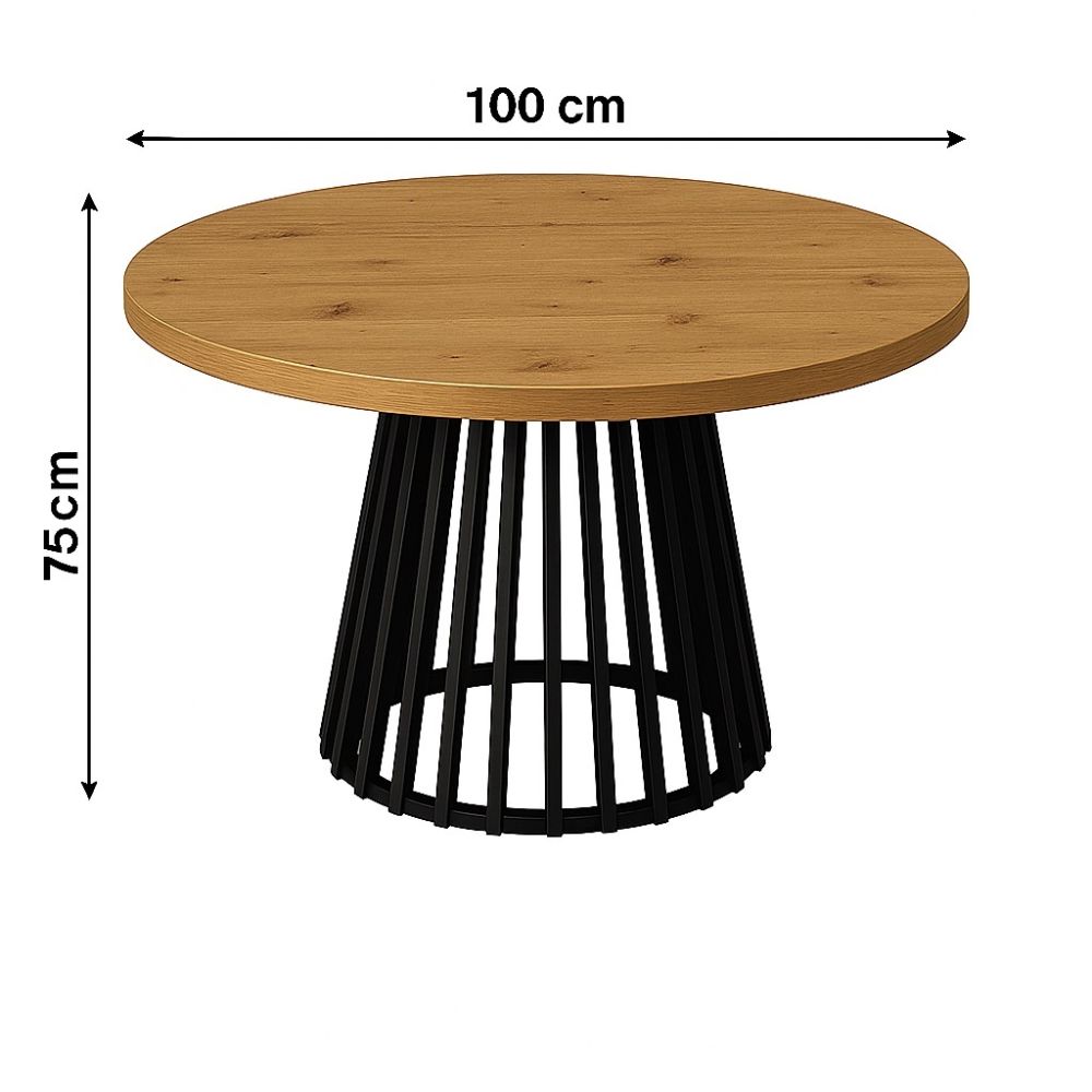 Praktyczny stół w stylu LOFT. Blat wykonany z płyty laminowanej o średnicy Ø 100cm i grubości 36mm. Masywna podstawa o średnicy 56cm wykonana jest z metalu przypominającą lamele dostępne w trzech kolorach: Biały, Złoty lub Czarny malowane proszkowo.