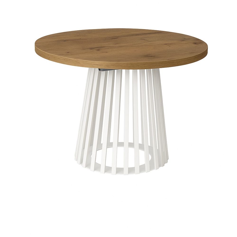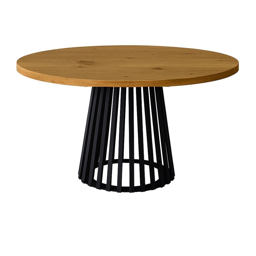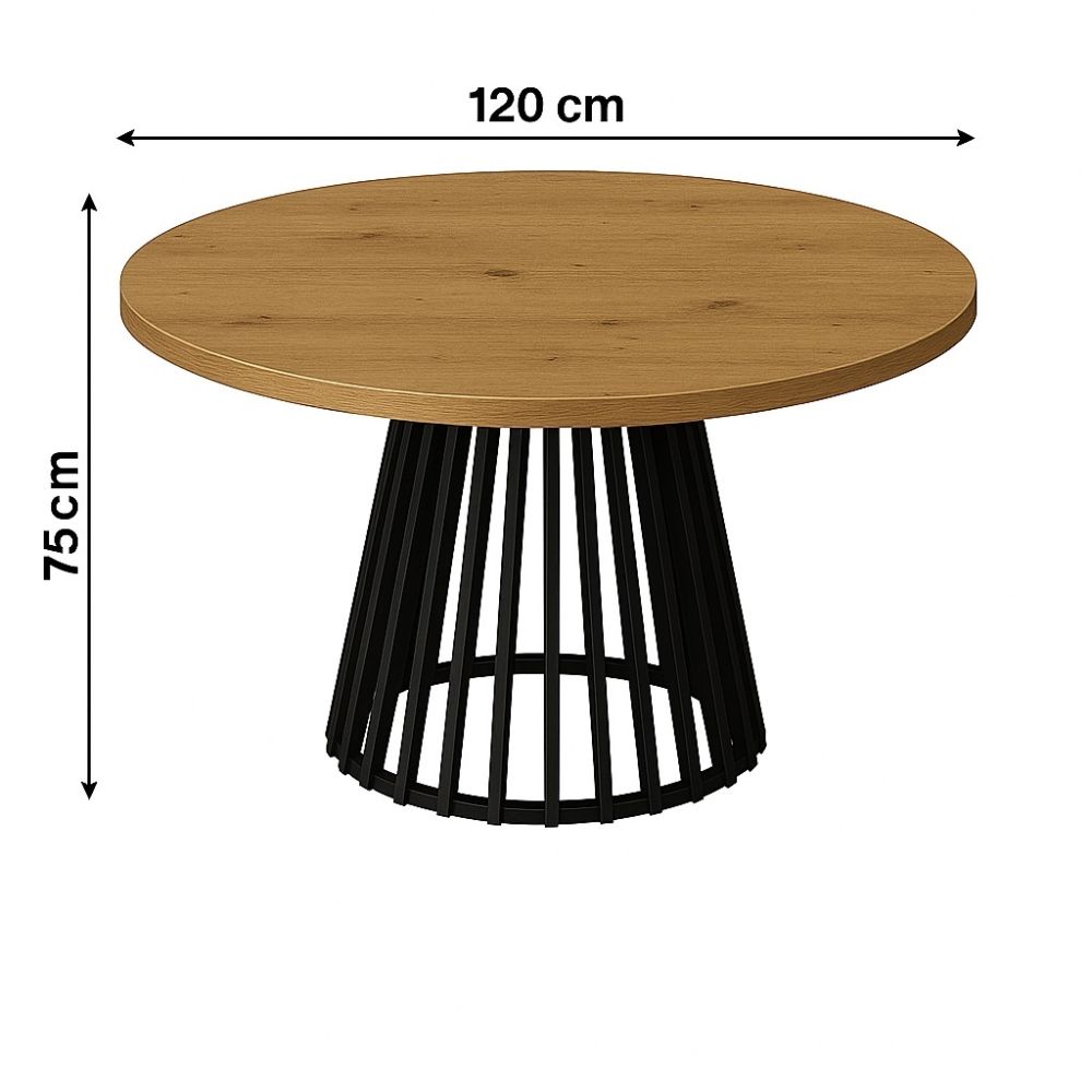 Praktyczny stół w stylu LOFT. Blat wykonany z płyty laminowanej o średnicy Ø 120cm i grubości 36mm. Masywna podstawa o średnicy 56cm wykonana jest z metalu przypominającą lamele dostępne w trzech kolorach: Biały, Złoty lub Czarny malowane proszkowo.