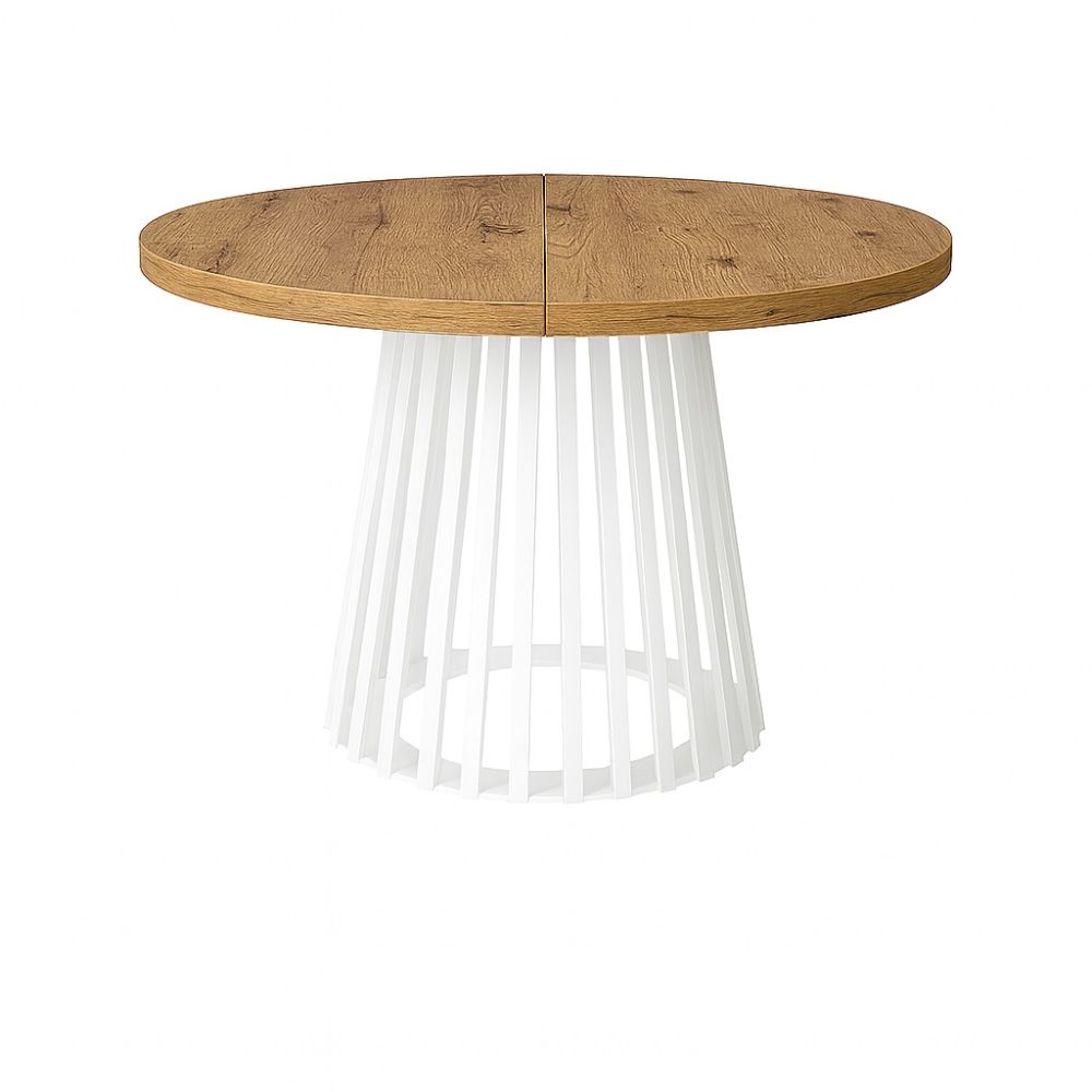 Funkcjonalny stół rozsuwany o średnicy blatu Ø 80cm i grubości 36mm z dwiema wkładkami (2x50cm). Do rozsuwania blatu zastosowane są solidne metalowe prowadnice. Masywna podstawa o średnicy 56cm wykonana jest z metalu przypominającą lamele dostępne w trzech kolorach: Biały, Złoty lub Czarny malowane proszkowo.