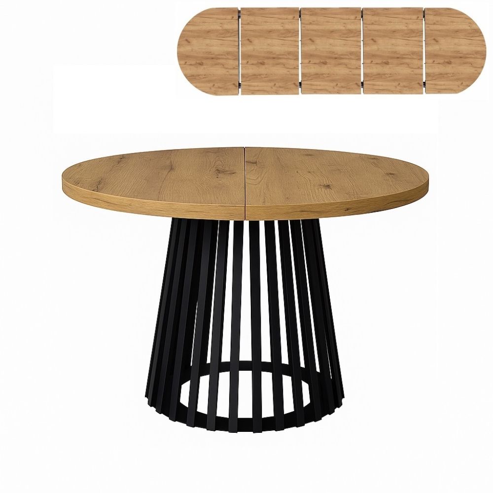 Funkcjonalny stół rozsuwany o średnicy blatu Ø 100cm i grubości 36mm z trzema wkładkami (3x50cm). Do rozsuwania blatu zastosowane są solidne metalowe prowadnice. Masywna podstawa o średnicy 56cm wykonana jest z metalu przypominającą lamele dostępne w trzech kolorach: Biały, Złoty lub Czarny malowane proszkowo.