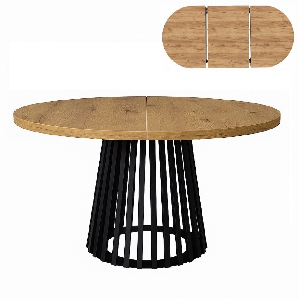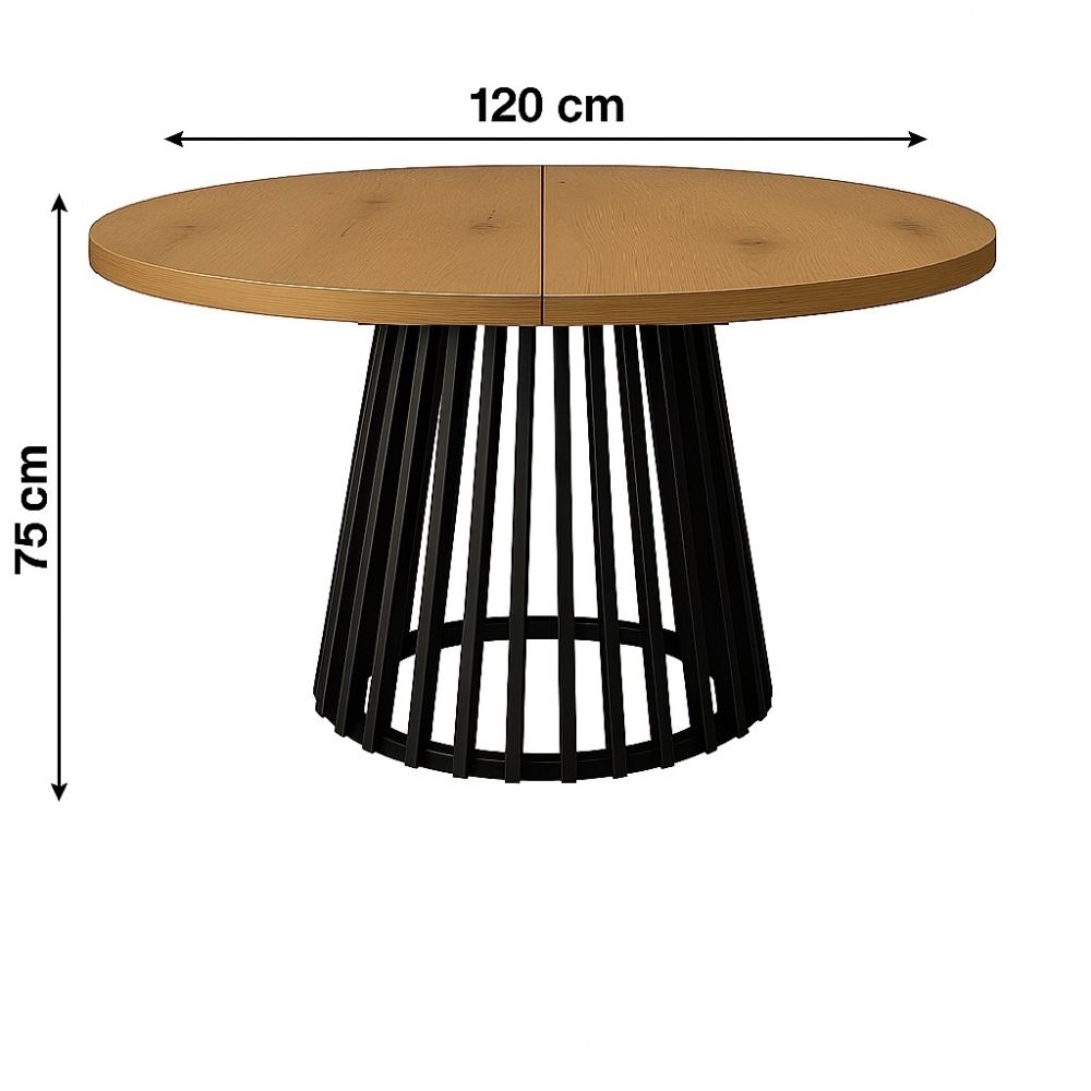 Funkcjonalny stół rozsuwany o średnicy blatu Ø 120cm i grubości 36mm z jedną wkładką (1x50cm). Do rozsuwania blatu zastosowane są solidne metalowe prowadnice. Masywna podstawa o średnicy 56cm wykonana jest z metalu przypominającą lamele dostępne w trzech kolorach: Biały, Złoty lub Czarny malowane proszkowo.