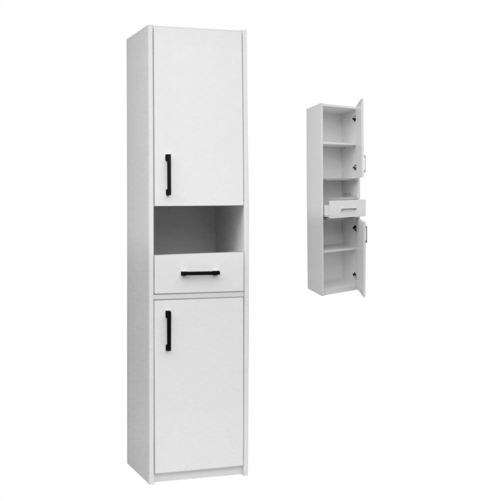 Szafka łazienkowa stojąca wykonana jest z płyty laminowanej o grubości 18mm. Obrzeża oklejane są okleiną PCV.