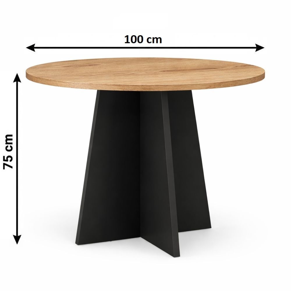 Okrągły stół o średnicy 100cm. Wykonany jest z płyty laminowanej o grubości 18mm. Obrzeża oklejane są okleiną PCV.